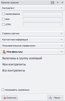 В области "Мои фильтры" Панели поиска предусмотрена возможность отбора контрагентов по следующим критериям: