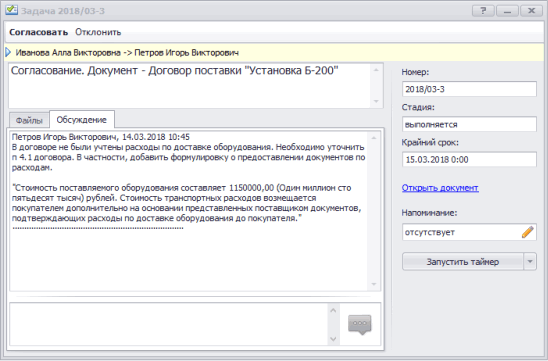 - Обсуждение. Комментарии, внесенные исполнителем задачи (например, при согласовании документа), будут приведены и в карточке документа