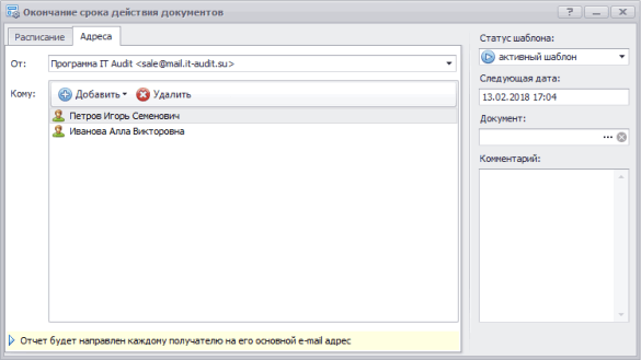 Программа IT Audit позволяет создавать и направлять пользователям необходимые отчеты по расписанию. Отчеты направляются пользователям на электронную почту и (или) сохраняются в указанном пользователем документе.