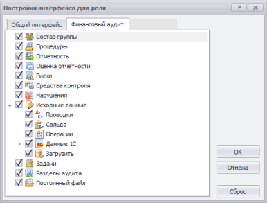 • На вкладке Общий интерфейс открывшейся формы настраивается общий интерфейс программы. На вкладке Финансовый аудит настраивается интерфейс для пользователей модуля Финансовый аудит. Установите или снимите флажок с необходимым пунктом.